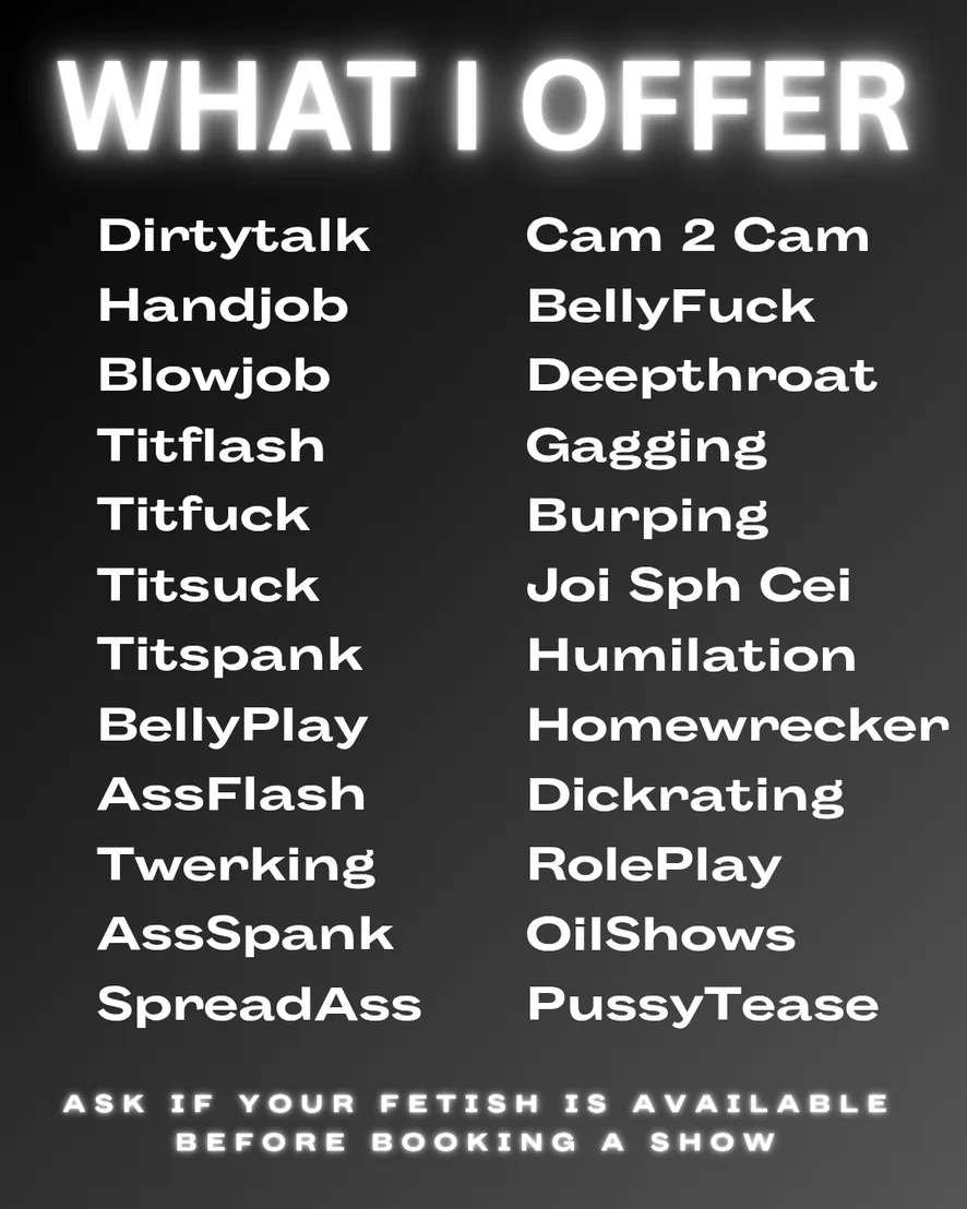 วับๆ แวมๆ, เปลือยอก, โบลว์จ๊อบ, คุยเรื่องลามก, ท่าหมา, ใช้มือ, นวด, ตีก้น, ใช้หน้าอก, ทเวิร์ก, Burping, SPH, CEI, โรลเพลย์, โชว์น้ำมัน, นายหญิง, แนะนำการช่วยตัวเอง, ทำให้อับอาย, ทำให้สำลัก, นั่งทับหน้า, เต้นยั่ว, ดีปโทรต, การให้คะแนนเจ้าโลก